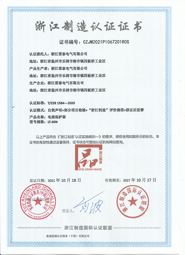 浙江雷泰電氣經過3年時間的申請認證及審核,成功榮獲該榮譽,獲得全國首張防雷行業的浙江制造認證證書。這是浙江省品牌建設聯合會及社會以及市場對我公司的肯定。