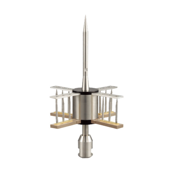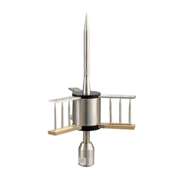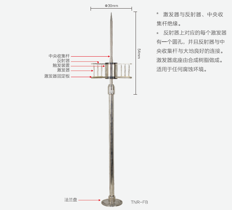 提前預放避雷針的激發器與反射器和中央收集桿是絕緣的。激發器與反射器有頁數的尖端結構,激發器從自然界的電廠中吸收并貯存能量。反射器與避雷針先與大地良好相接,電位相同。通常情況下,激發器與反射器之間有一定的電磁場強度。雷電接閃前,避雷針在靜電感應作用下,避雷針上的異種電荷迅速增多,電場強度迅速增強激發器與反射器之間的電壓迅速增加,尖端打火擊穿周圍的空氣。