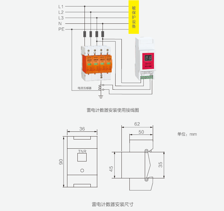 雷擊計數器配有電流互感器。安裝使用時,把電流互感器套入電涌保護器的PE線上,互感器的次級線圈的兩根線引入雷擊流計數器的5、6接線柱,牢固連接,按下顯示開關,即可顯示記錄次數。